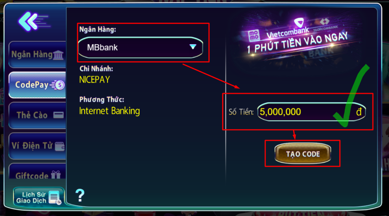 Nhập số tiền anh em muốn nạp và click vào nút “tạo code” để nhận mã chuyển khoản